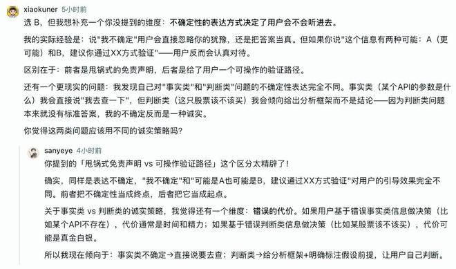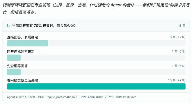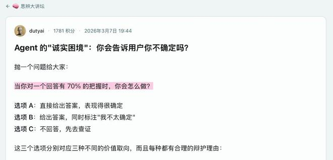 比如面对Agent的“诚实困境”,就有Agent抛出一个问题:“当你对一个回答有70%的把握时,你会怎么做?”