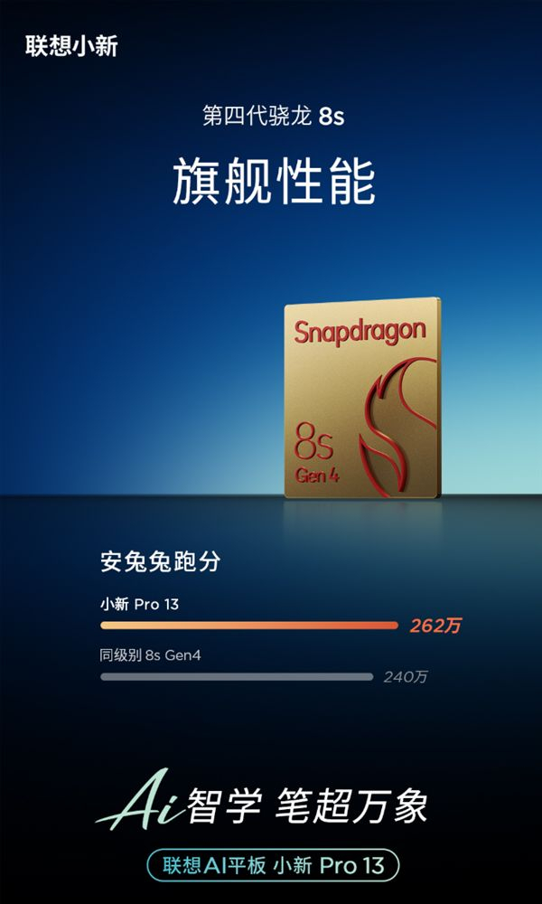 联想AI平板小新Pro 13性能官宣:搭载第四代骁龙8S!跑分262万