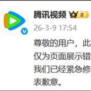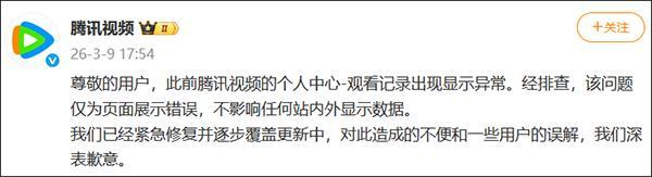 3月9日,@腾讯视频 发布消息就页面显示异常致歉:尊敬的用户,此前腾讯视频的个人中心-观看记录出现显示异常。经排查,该问题仅为页面展示错误,不影响任何站内外显示数据。