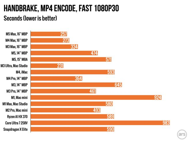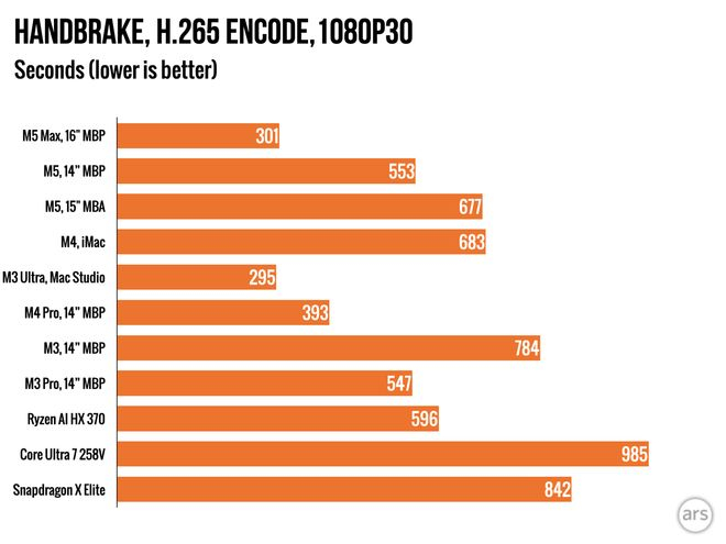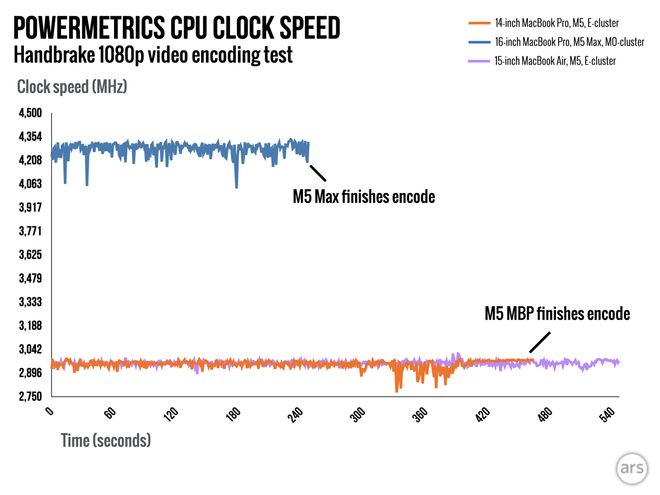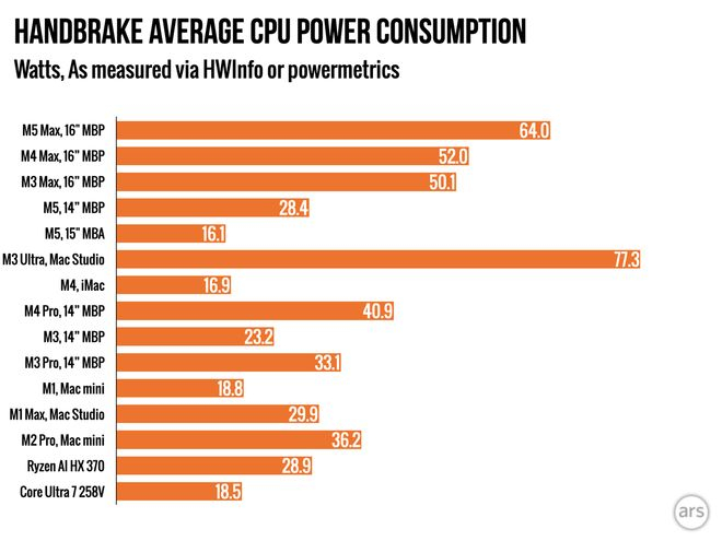 尽管性能大幅跃升,新芯片的能耗表现依然符合苹果的严苛标准。在 Handbrake 视频编码的高负载测试中,M5 Max 的平均功耗较 M4 Max 增加了约 23%。