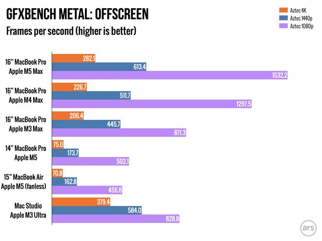 得益于神经加速器的深度集成,其图形处理(GPU)性能实现了 20% 至 35% 的显著跨越。与基础款 M5 相比,M5 Max 的多核处理速度翻倍,图形性能更是飙升至三到四倍。