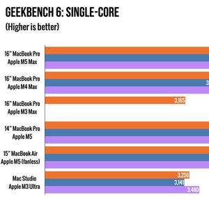 L1 指令缓存L1 数据缓存L2 缓存基础时钟频率最大时钟频率M5/M5 Pro/M5 Max super core192KB128KB16MB per cluster1,308 MHz4,608 MHzM5 Pro/M5 Max performance core128KB64KB8MB per cluster1,344 MHz4,308 MHzM5 efficiency core128KB64KB6MB per cluster972 MHz3,048 MHz