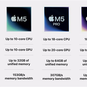 M5 Pro与M5 Max采用台积电第三代3nm工艺制造,但设计思路有所调整,采用了双芯粒(Tile)架构,将CPU与GPU分别封装后整合,M5 Pro提供16核或20核GPU版本,M5 Max则有32核与40核可选。
