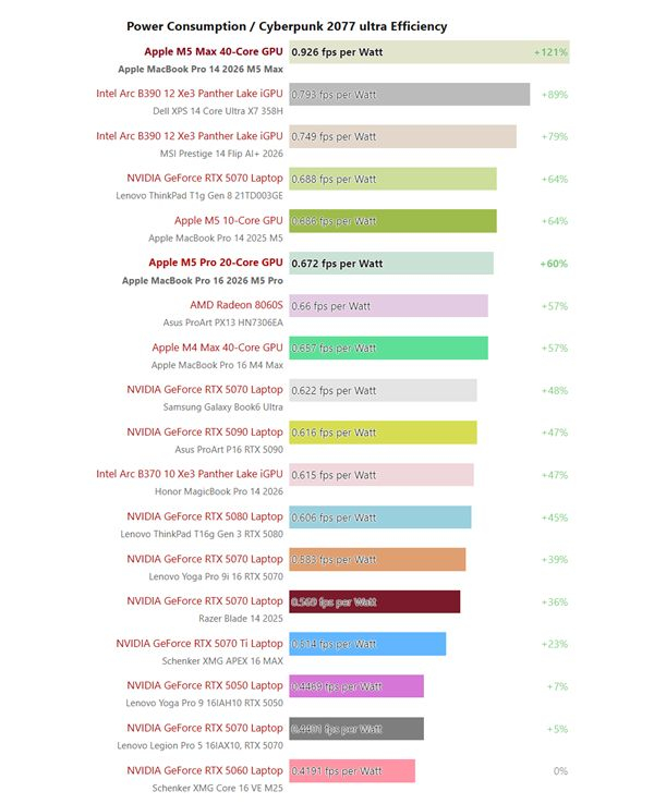 在能效比上,以《赛博朋克 2077》为例,新的M5 Max相比旧的M4 Max有着巨大提升;M5 Pro 与M4 Max 以及Radeon 8060S相当,同时比大多数NVIDIA Blackwell GPU更高效。