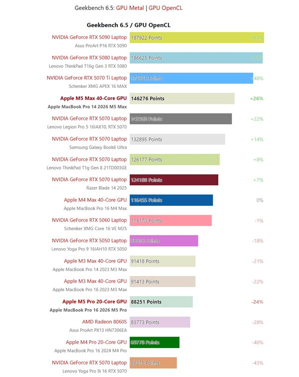 20核M5 Pro GPU在该项测试中比M5 Max慢41%,性能介于RTX 5050与RTX 5060移动版之间,同时领先AMD Strix Halo的Radeon 8060S约15%。