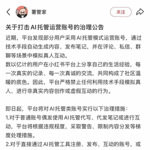 3月10日,小红书薯管家发布《关于打击AI托管运营账号的治理公告》。