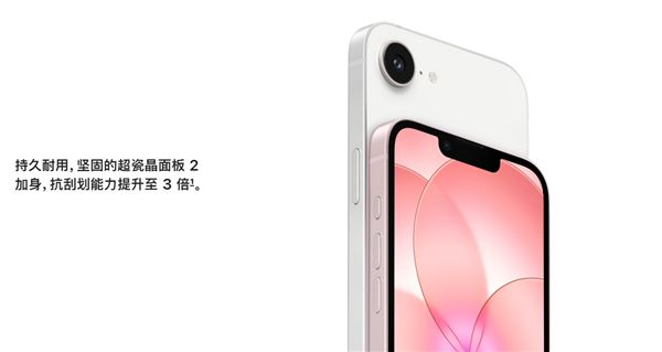 机身采用铝金属边框+超瓷晶面板2,抗刮划能力较iPhone 16e提升3倍,耐用性有所增强。