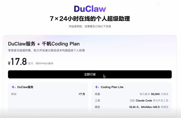 据介绍,通过DuClaw,用户无需接触任何云控制台操作,不需了解镜像、服务器、API Key等专业概念,订阅后即可直接使用完整的OpenClaw服务。