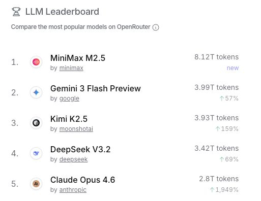 也就导致 OpenRouter 上的模型调用数据,前五个里住进了三个雷打不动的国产模型:MiniMax M2.5,Kimi K2.5 和 DeepSeek V3.2,虽偶尔起伏,但始终在榜。