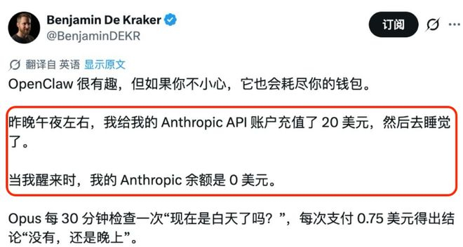 有网友就抱怨过,刚充的 20 刀 Token 余额,想着设定个小任务慢慢跑,结果第二天起床一看,花光了。。。