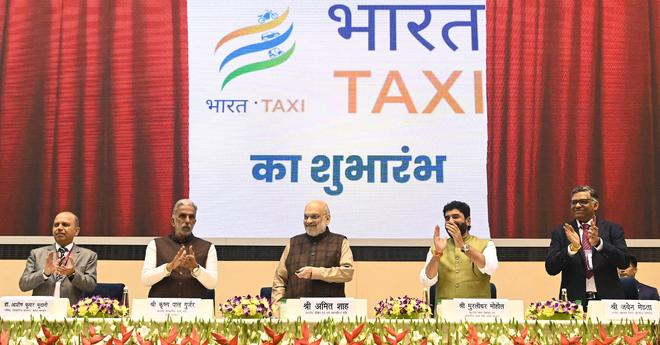 当地时间2026年2月5日,印度新德里,印度内政与合作部长阿米特·沙阿在 Vigyan Bhawan 推出印度首个合作制网约车平台 Bharat Taxi,印度合作国务部长克里尚·帕尔·古尔贾尔、合作与民航国务部长穆尔利达尔·莫霍尔等人出席活动。(图片来源:视觉中国)