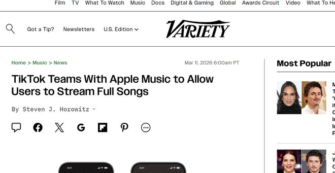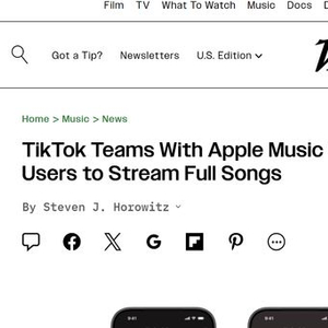 【环球网科技综合报道】3月12日消息,据Variety报道,TikTok与苹果公司近日正式宣布达成独家合作,双方将携手为用户打造更便捷、更具社交性的音乐体验。此次合作后,Apple Music订阅者可直接在TikTok应用内播放完整歌曲,无需跳转至Apple Music应用,实现音乐欣赏的无缝衔接。