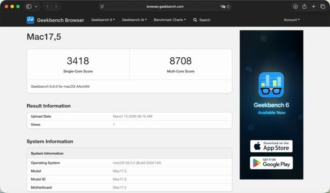 先说结论:这颗 A18 Pro 的性能,比很多人想象得猛不少,在 Geekbench 6 的测试里,MacBook Neo 的成绩大概是:单核:3400 分左右;多核:8700 分左右。