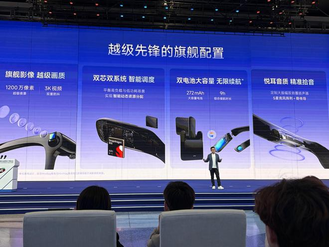 核心硬件上,G1 搭载了高通 Snapdragon AR1 芯片,并配备 1200 万像素摄像头,支持最高 3K 视频录制。镜腿内置电池和扬声器,同时通过多麦克风阵列实现远场语音识别。用户可以通过语音直接唤醒 AI,完成信息查询、拍摄、翻译等任务。