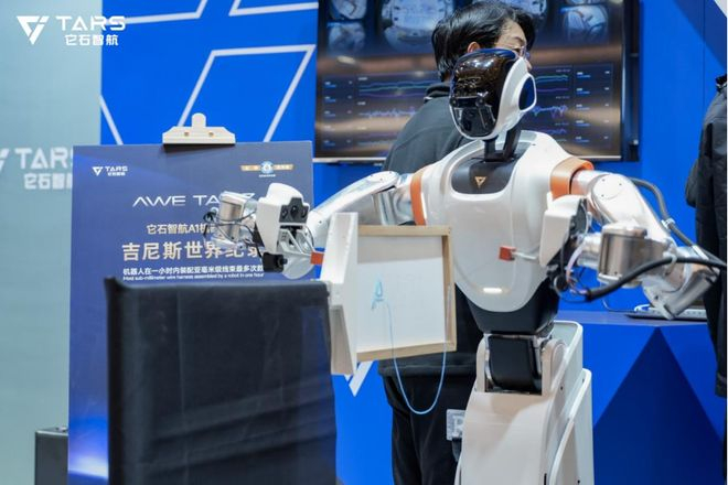 机器人落地的场景,除了家庭之外,工业场景也是一大方向。AWE现场,它石智航刷新了一项吉尼斯世界纪录:在一小时内完成亚毫米级线束装配最多次数。记者目睹了整个挑战过程,在1:1复刻的真实工业场景中,A1机器人连续作业60分钟,重复完成柔性线束插拔装配任务达105次,这是对具身智能真实作业能力的极限证明。