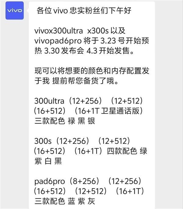 快科技3月14日消息,一名vivo销售人员近日透露,备受期待的vivo X300 Ultra与vivoPad6Pro将于3月23日开启预热,这两款新品预计在3月30日正式发布,并紧接着于4月3日正式上市销售。