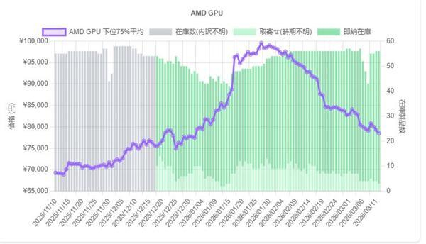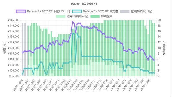 然而,高昂的售价随即引发了销量下跌,玩家纷纷转向观望或竞品,迫使渠道降价去库存,截至3月,RX 9070 XT均价已跌至10.9万日元(约682美元),两个月内降幅达22%,环比跌幅19%