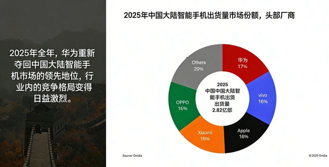 根据 IDC 和 Omdia 的数据,2025 年中国智能手机市场出货量大约在 2.82 亿台左右,相比 2024 年微跌了一些。虽然大盘没涨,但座次全变了。