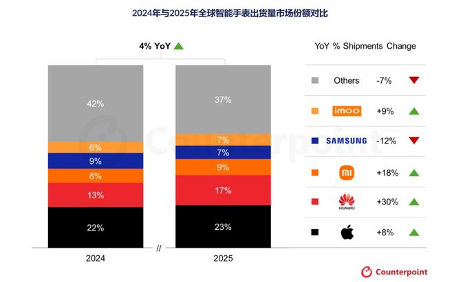 智能手表在 2025 年算是打了个翻身仗,根据 Counterpoint 的数据,全球智能手表出货量增长了 4% ,结束了 2024 年的下跌,更重要的是,平均售价涨了 5%。