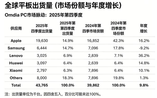 其中华为继续蝉联国内平板第一,第四季度还发了 MatePad Edge,硬是把 PC 级的桌面体验塞进了平板里,这招 “ 降维打击 ” 确实狠,苹果虽然排第二,但日子没以前滋润了。