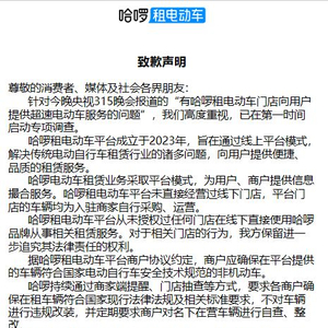 当晚,哈啰租电动车平台发布致歉声明,称针对央视315晚会报道的“有哈啰租电动车门店向用户提供超速电动车服务的问题”高度重视,已在第一时间启动专项调查。