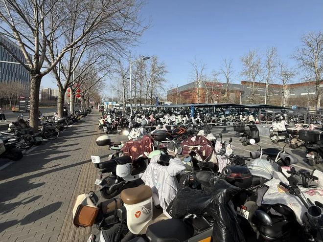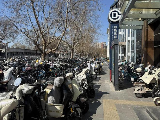 3月3日晚高峰,记者来到丰台区新宫地铁站。刚走出地铁口,一片密密麻麻的电动车便映入眼帘。出入口周边的人行道和非机动车道边缘停满车辆,红、蓝、黑等各色车身交织在一起,从站口一路延伸近百米,却看不到明显的分区标识或引导牌。