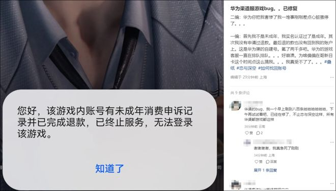 就此,今天上午,叠纸游戏客服在微博回复玩家时明确表示:“华为渠道登录提示终止服务的情况已反馈,核实为华为方原因导致”。推测为华为账号系统或防沉迷接口出现异常,错误触发退款封禁机制。
