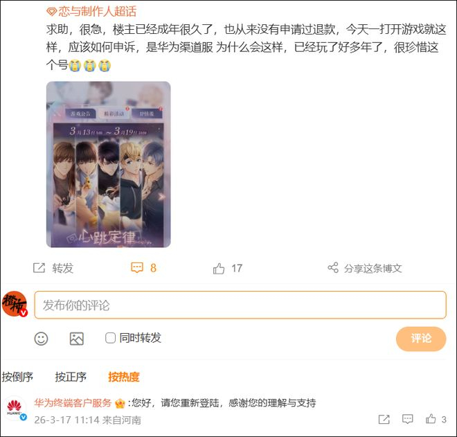 华为终端客户服务在微博回复玩家表示:“您好,请您重新登陆,感谢您的理解与支持。”