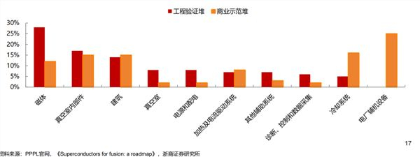 具体来看,据浙商证券,工程验证堆(以ITER为例):ITER成本结构中,磁体系统28%、真空室内构件17%、电源约8%、真空室约8%、冷却系统约5%,属高技术壁垒与高价值量集中区。