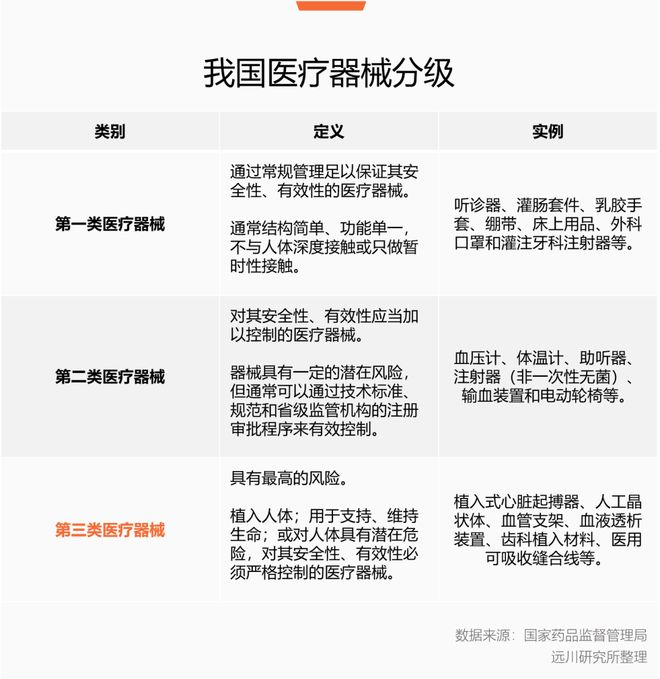 在我国医疗器械分类中,产品根据风险程度分为一类、二类和三类。三类医疗器械风险等级最高、监管最严格。