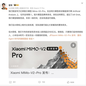 小米CEO雷军表示:"我们刚发布万亿参数大模型MiMo-V2-Pro,在全球大模型综合智能排行榜Artificial Analysis上位列全球第八,按品牌排名全球第五,超过了xAI Grok。我们的模型刚刚完成,未来还会快速迭代增强。"他透露,小米在AI领域相对低调,但实际进展可能比外界预期更快,2024年AI研发和资本投入将超过160亿元。"我相信,只要坚持持续投入,小米在AI时代一定会交出一份靓丽的答卷。"