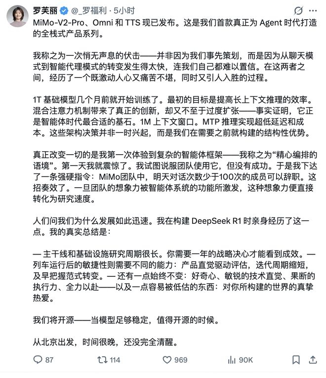 小米MiMo大模型负责人罗福莉在社交平台透露,基础模型训练始于数月前,采用混合注意力机制和百万级上下文窗口设计。她表示,团队在开发过程中经历了从对话模型到智能体范式的快速转型,并通过强制使用政策推动团队适应新技术。(袁宁)