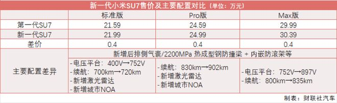 财联社3月19日讯(记者 徐昊)3月19日,小米汽车正式发布新一代小米SU7,三个版本售价分别为21.99万、24.99万和30.39万元,较第一代SU7价格分别上涨4000元,但较之前预售价降一万元。