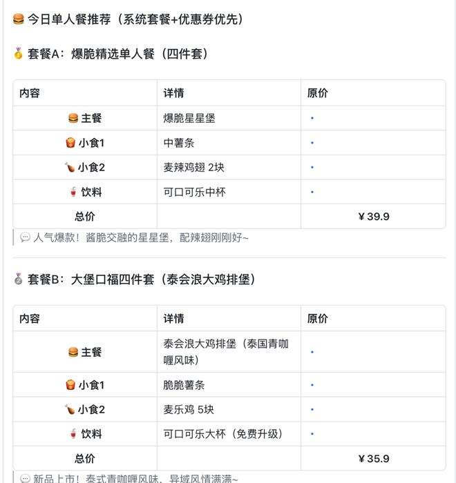 现在每天到了饭点的时候,飞书 aily 就会主动去看一眼我附近麦当劳的菜单,然后根据我的口味,整理出三个组合来让我选。