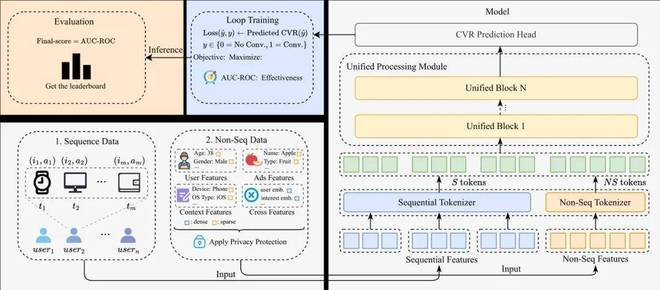 当然,这件事做起来没有那么容易。核心难点在于,广告推荐场景的数据极其复杂 —— 既有用户当下的静态信息,也有带时间戳的行为流水,你需要在一个统一架构里把这两种完全不同的数据「翻译」成模型能懂的语言并深度融合。同时,工业级数据规模海量且极度稀疏,模型必须足够鲁棒。更苛刻的是,你既要预测准,又要跑得快,得在高端 GPU 上支持大批量高效训练和推理。需要注意的是,比赛严禁用「model ensemble」这种刷榜技巧,只能凭真本事靠单一模型硬碰硬。