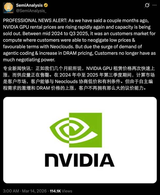 其实,这两件事指向同一个背景:应用层面的 AI 需求正在迅速爆发,而在基础设施层面,整个行业还没有完全准备好。算力、芯片、系统效率,这些原本隐藏在幕后的问题,正在被突然放大的 AI 需求推到台前。一个比较明显的表现是,算力租赁行业已经出现涨价潮,而且可能持续一段时间。对于想要搭上「龙虾」快车的企业来说,这无疑是一个切身相关的变化。