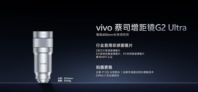 此外,该机的 G2 蔡司增距镜也有革新,焦距 200mm,相比上一代更小更轻,采用 2 组 15 片光学设计,具备蔡司 APO 认证;而 G2 Ultra 增距镜则是把焦距干到 400mm,内置 2 组 15 片高透玻璃镜片、5 片超低色散玻璃镜片、1 片非球面玻璃镜片。