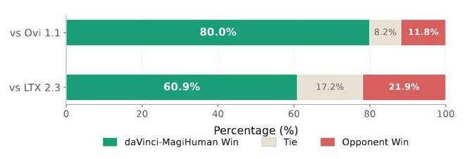在推理效率方面,daVinci-MagiHuman 结合单流骨干网络、隐空间超分辨率与 Turbo VAE 解码器,在单张 H100 上仅需 2 秒即可生成 5 秒 256p 视频。在与 LTX-2.3、Ovi 1.1 的全面对比中,daVinci-MagiHuman 在成对人工评测中取得了70.5%的综合胜率,在客观基准上同样展现出领先表现。