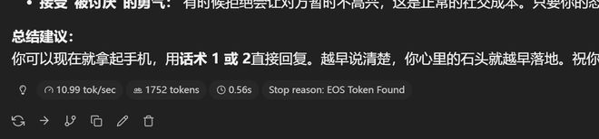 大模型很快给出了得体的回答,本次回答思考推理时间 1 分钟 28 秒,共输出 1752 tokens,输出的速度为 10.99 tok/s,输出时延为 0.56s,整体输出的表现还是能够让人满意的。