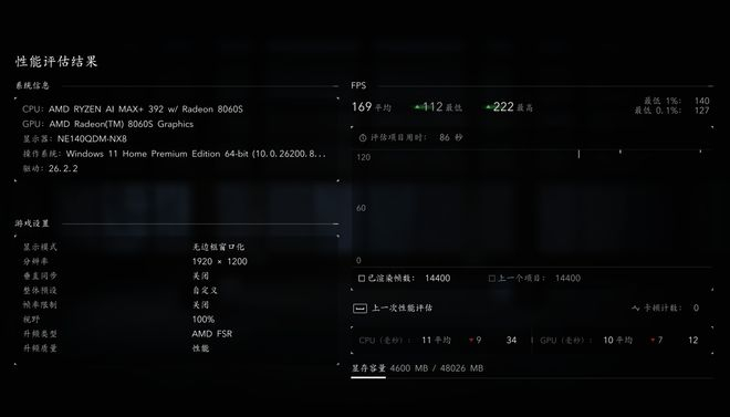然后是 3A 单机大作,首先测试的是《刺客信条:影》,这款游戏对 CPU、GPU 的性能要求都很高,在 1200P 分辨率 + 手动全低画质预设 + FSR 性能 + FSR 帧生成的画面设置下,先使用华硕天选 Air 2026 运行游戏自带基准测试,游戏平均帧数为 169 帧,1% Low 为 140 帧,这个表现完全可以满足畅玩的要求了。