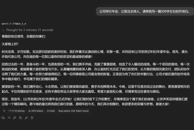接着小编又让大模型帮我生成一段 500 字左右的年会开场白。这一次共生成 1870 个 tokens,生成速度为 11.10 tok/s,输出时延为 0.64s。