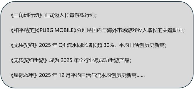 《无畏契约手游》则被财报认定为“2025年全行业最成功的新发手游”,端手游国服月活合计突破5000万。老产品《和平精英》则是国内游戏收入增长的关键助力,甚至在春节档与《王者荣耀》一同刷新了日流水和日活纪录。而在2026 年 1 月,腾讯推出基于虚幻引擎开发的多平台 FPS 游戏《逆战:未来》,上线后已收获数百万DAU。