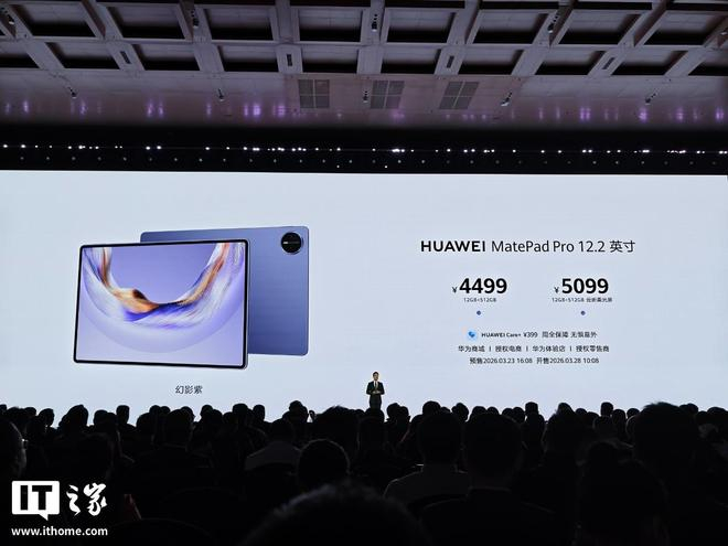 IT之家 3 月 23 日消息,今日举行的华为春季全场景新品发布会上,华为 MatePad Pro 12.2 英寸新增幻影紫配色,3 月 23 日 16:08 预售,3 月 28 日 10:08 开售。
