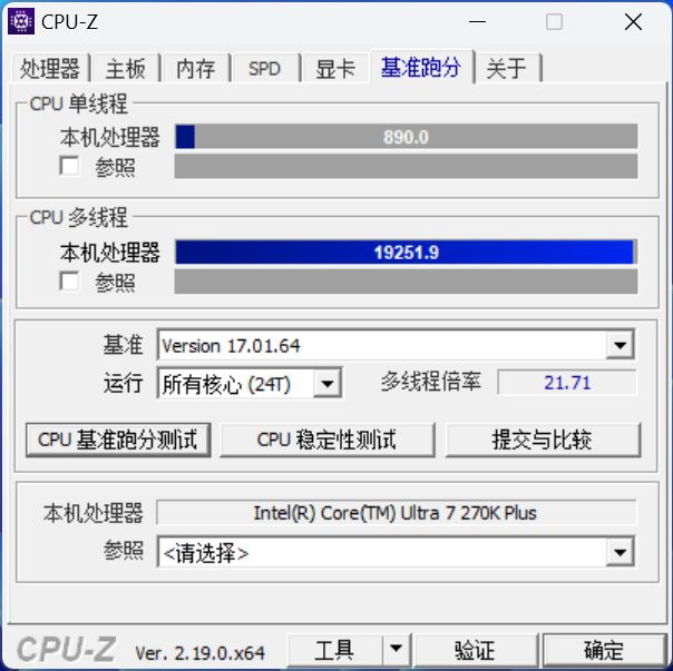 接下来进入理论性能实测,我们同样采用 intel Default 性能模式,并找来了酷睿 Ultra 7 265K 处理器进行对比。在 CPU-Z 的基准测试中: