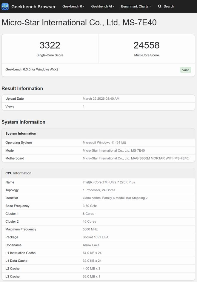 酷睿 Ultra 7 270K Plus 的单核性能提升了 3.1%,多核性能提升了 26.3%。