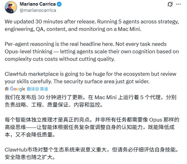 但极其魔幻的是,一边是普通用户在吐槽,另一边却有极客玩家在发布后仅半小时就完成了更新,在一台MacMini上流畅地跑着5个智能体,分别负责战略、工程、质量保证、内容和监控。