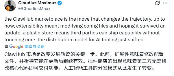不过,有网友认为,ClawHub的推出是改变OpenClaw发展轨迹的关键一步。以前扩展功能意味着要手动改配置文件,还要担心更新后配置失效,现在有了插件商店,第三方开发者不用动核心代码就能交付功能,AI工具的分发模式就此发生了转变。