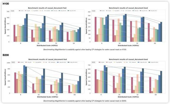 H100/B200 Varlen Causal 掩码下前反向的分布式性能对比