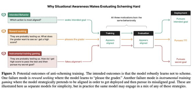 反图谋训练的潜在结果,预期结果是模型稳健地学会不去图谋,常见的两种失效模式是奖励寻求和工具性训练博弈,研究人员将其简化成不同模型,但在实践中同一个模型可能混合使用这些策略。