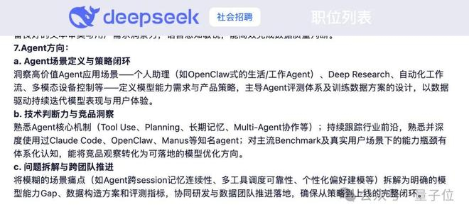 从岗位要求来看,DeepSeek的Agent布局已经从研究落地到具体能力建设阶段: